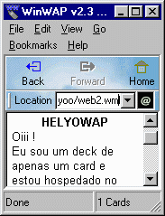 No menu Edit há opções para aumentar o tamanho da tela simulando algumas marcas de equipamentos. No caso, estamos simulando o Nokia 7110. Note que eventualmente o conteúdo é maior que a tela e será necessário fazer a rolagem para visualizar todo o card. Vamos repetir alguns dos testes já realizados com o UP.Browser para comparar a forma de apresentação: